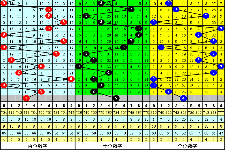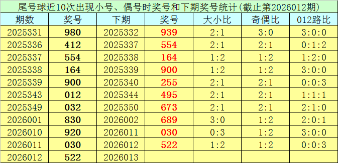 尾号球:上期奖号为2,开出小 号、偶号,该位前10次开出小 号、偶号的现象时其奖号分别为:980、412、554、164、900、012、032、830、920、030,其中尾号球012路比为5:2:3。