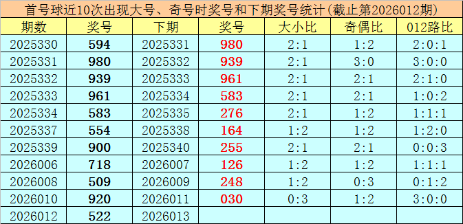 在首号球前10次开出大号、奇号类型之后,其下期分别开出奖号:980、939、961、583、276、164、255、126、248、030,其中号码奇偶比为6:4,大小比为4:6,012路比为4:2:4。
