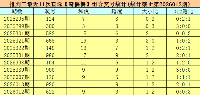 开奖回顾:排列三第2026012期开出奖号:522,类型为组三,和值为9,奇偶比为1:2,大小比为1:2,跨度为3。