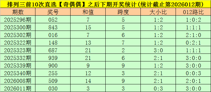 5.下期奖号跨度分别开出:5、5、6、7、2、6、9、3、9、3,其中跨度012路比为6:1:3,大小比7:3,奇偶比为7:3,本期适当关注0路跨度开出,参考跨度6。