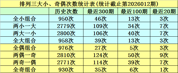 连续10期奖号中,两小一大形态开出5期,两大一小形态开出3期,全大形态开出1期,全小形态开出1期,本期大小形态判断:两大一小奖号。