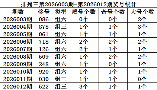 上期回顾:排列三第2026012期开奖:522,质合比为3:0,奇偶比为1:2,大小比为1:2。