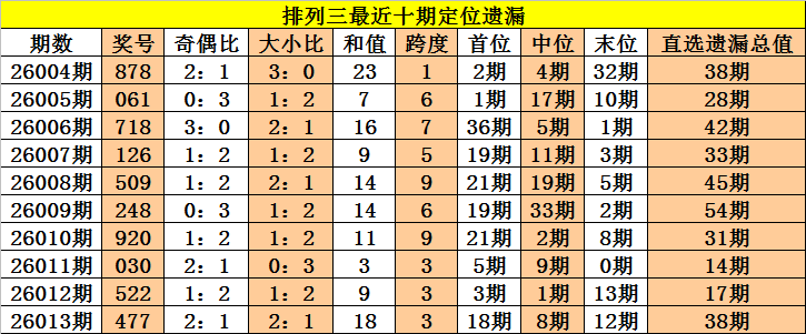 开奖回顾:排列三第2026013期奖号:477,定位直选遗漏值18期、8期、12期,遗漏总值为38期。