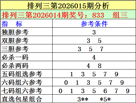 1.排列三最近十期分别开出号码:061-718-126-509-248-920-030-522-477-833,其中有4期奖号开出了上期的重复号码,本期预计第2026014期奖号:833中有重号,参考号码:3。