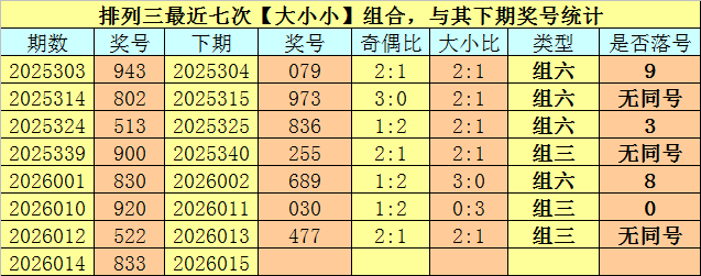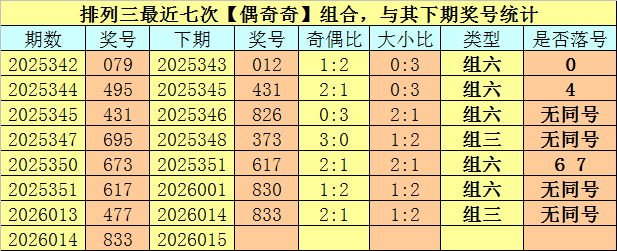 开奖回顾:排列三第2026014期开奖号码为:833。奖号类型为:组三,大小类型为:大小小,奇偶类型为:偶奇奇,无重号。