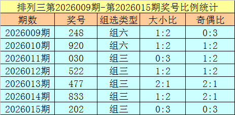 排列三第2026015期回顾:奖号202,奇偶比0:3,大小比0:3,和值4,类型:组三。
