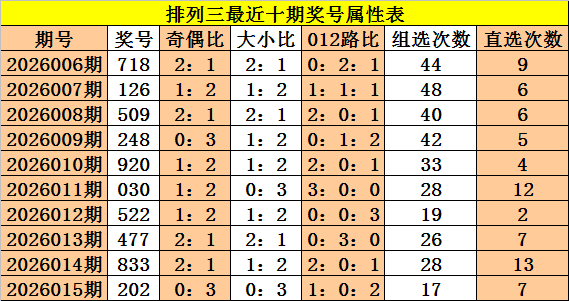上期回顾:体彩排列三第2026015期奖号:202,奇偶比0:3,大小比0:3,012比1:0:2。