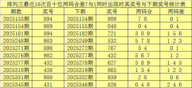 百十位合差分析:上期奖号百十位开出89组合,两码合为7,两码差为1,最近10次百十位两码合7与两码差1同时出现时,其奖号和下期奖号分别为:
