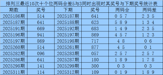 十个位合差分析:上期奖号十个位开出96组合,两码合为5,两码差为3,最近10次十个位两码合5与两码差3同时出现时,其奖号和下期奖号分别为: