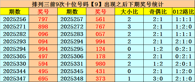 十位号码:十位上期开出偶数、大号、0路号码:9,历史上十位号码9共开出776期,上一次出现在第2025347期,上期奖号遗漏值为21期。