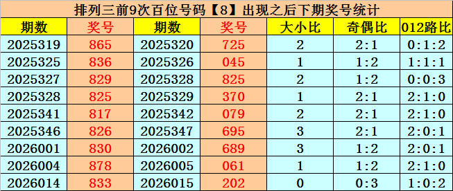 在百位前9次出现号码8之后,下期百位分别开出奖号:7-0-8-3-0-6-6-0-2,其中开出号码个数012路比是6:1:2,奇偶比是2:7,大小比是4:5。