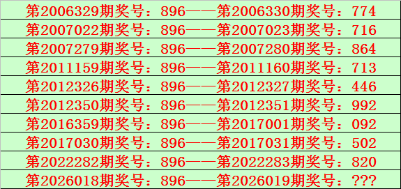 排列三第2026018期开出奖号896,该号码直选类型历史上出现了10次,前9次开出之后期下期奖号为:774、716、864、713、446、992、092、502、820,见下表:
