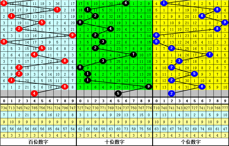其中,百位奇偶比为5:4,大小比为7:2,本期百位一码参考4。