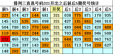 四、排列三直选号码321历史上开出7次,其前后五期奖号分别为: