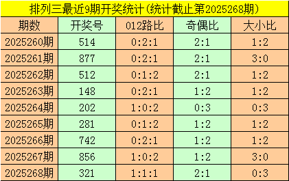 一、排列三第2025268期开出号码321,其奇偶比为2:1,大小比为0:3,号码012路比为1:1:1。该号码直选历史上出现了7次。