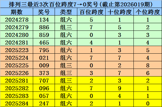 第2025281-第2025283期奖号:707、096、057,其下期奖号为:247,首位号码跨度为2;