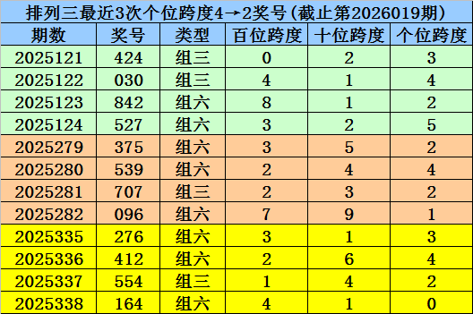 末位跨度分析:前3期末位奖号为2-6-8,最近两期末位奖号跨度为4、2,末位奖号跨度历史上连续两期开出4、2的现象共167次,其最近两次奖号为: