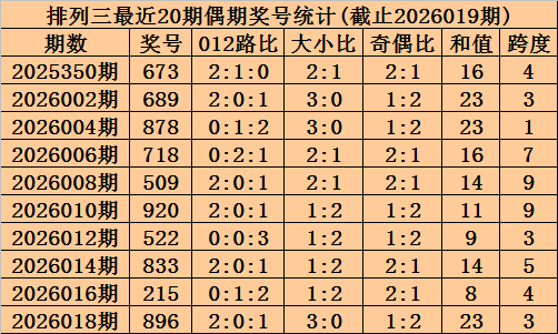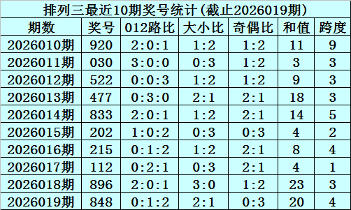 上期回顾:排列三2026019期奖号为848,奇偶比为0:3,大小比为2:1,跨度为20。