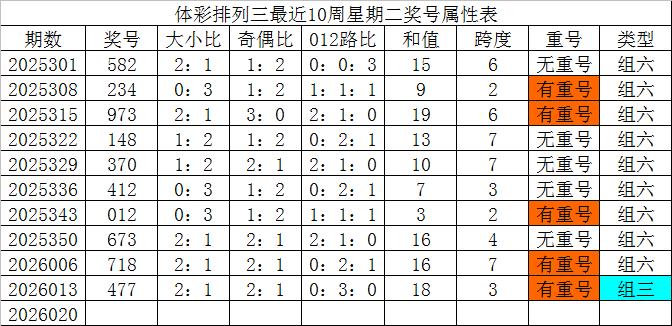 体彩排列三最近10周星期二奖号分别为:582、234、973、148、370、412、012、673、718、477,各奖号属性详见下表: