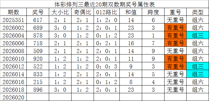 体彩排列三最近20期双数期奖号分别为:617、689、878、718、509、920、522、833、215、896,各期奖号详细属性下表: