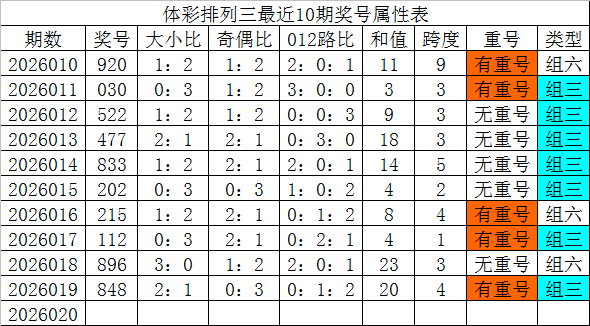 体彩排列三最近10期分别开出奖号:920、030、522、477、833、202、215、112、896、848,各奖号属性详见下表:
