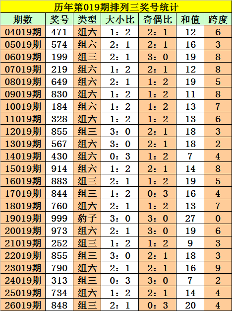 排列三第2026019期奖号:848,和值20,跨度4,大小比2:1,奇偶比0:3。