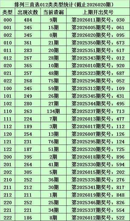 上期回顾:体彩排列三第2026020期开出奖号:095,其012路比为2:0:1,奖号012路类型为:002。
