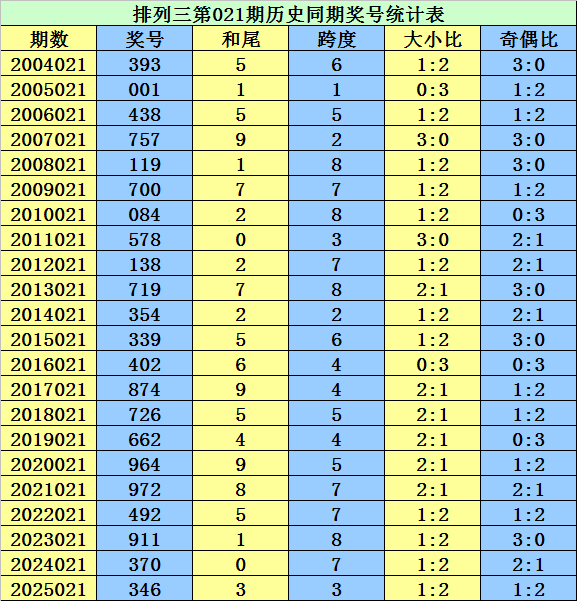 从2004年至今排列三已开出7495期奖号了,本期为排列三2026年第021期开奖,历史同期已出现22次奖号: