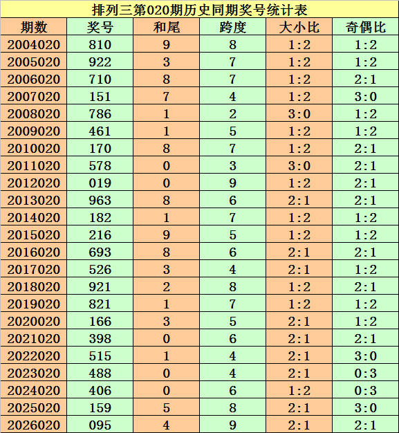 上期回顾:排列三第2026020期奖号开出095。