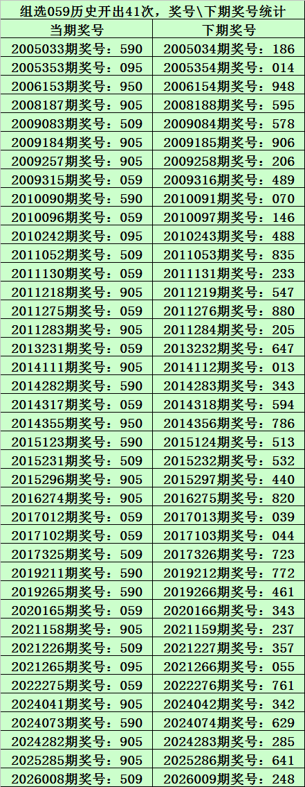 二、组选059分析:排列三历史上已开出41次组选号码059了,其奖号和下期开出奖号统计如下: