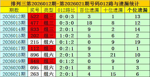 开奖回顾:排列三第2026021期奖号为:263,类型为组六,号码012路比为2:0:1,百十个位号码直选分别遗漏4期、15期和6期。