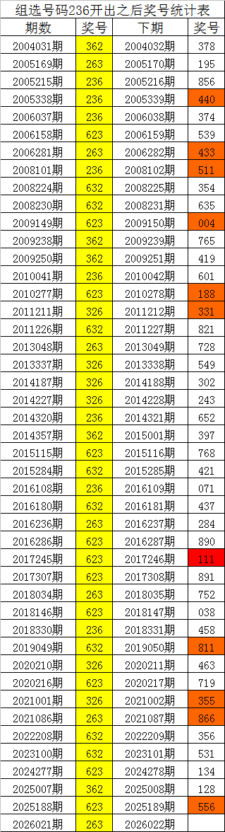 从上表统计可以看出,直选号码263开出之后,其下期奖号: