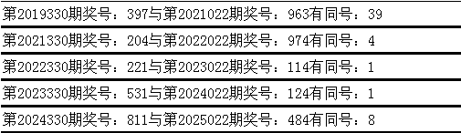 与前期历史同期奖号对比分析,在最近五年开奖中,第330期同期奖号与第022期同期奖号都出现了相同号码: