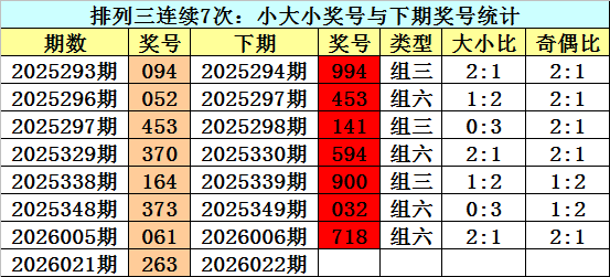 上期回顾:排列三2026021期奖号为:263。类型:组六,奇偶:偶偶奇,大小:小大小。