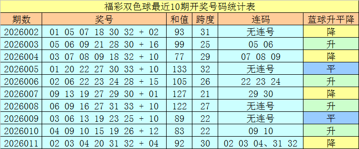 上期开奖:福彩双色球第2026011奖号开出:02 03 04 20 31 32 + 04,红球号码和值为92,首尾间距为30,包含连号:02 03 04、31 32。