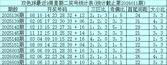 三区比分析:最近9周星期二三区红球个数比为19:16:19,第二区红球较冷,本期看好第二区红球热出,关注三区比1:3:2。