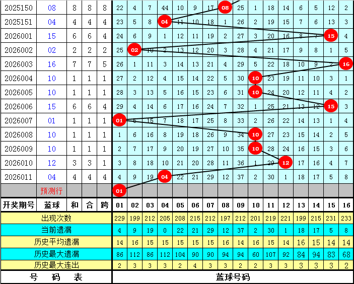 蓝球号码分析:上期蓝球为04,开出1路号码,蓝球最近10期012路比为2:7:1,最近30期012路比为9:14:7,最近100期012路比为28:40:32,本期蓝球看好1路号码,四码蓝球参考01、04、07、10。