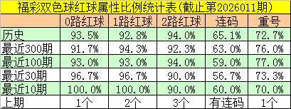 上期开奖:福彩双色球第2026011期奖号为:02 03 04 20 31 32 + 04,红球012路比为1:2:3,包含连码:02 03 04、31 32,开出1个重号:04。