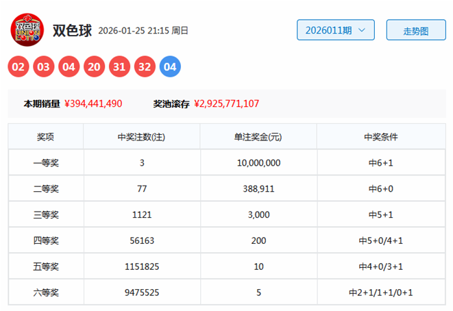 双色球第2026011期奖号为:02、03、04、20、31、32+04。