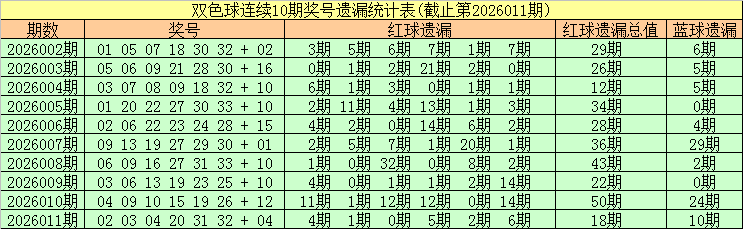 安队第2026012期双色球遗漏分析:(热码:遗漏0-3期,温码遗漏4-9期,冷码遗漏10期及以上)