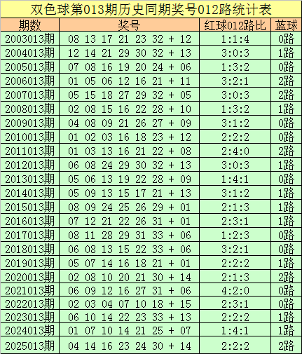 福彩双色球第2026013期历史同期王守礼012路奖号遗漏分析: