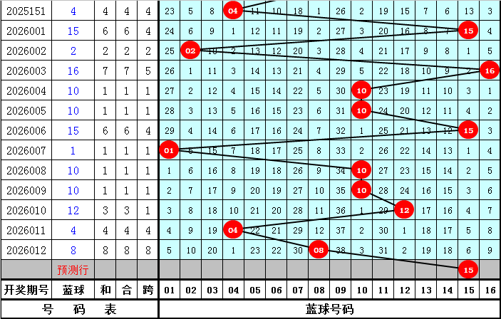蓝球分析:去年第013期蓝球奖号为14,开出2路蓝球,目前0路蓝球轮空3年,今年同期适当关注0路蓝球回补,看好号码15。