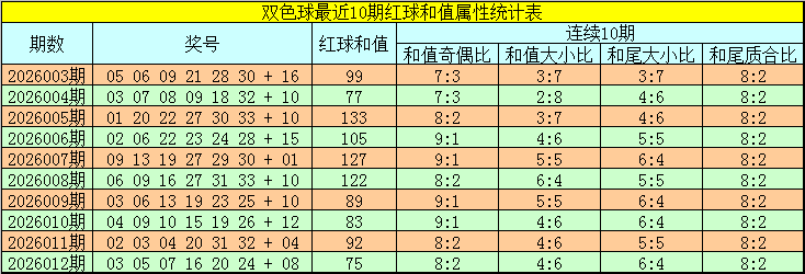 双色球红球最近10期开出和值分别为:99、77、133、105、127、122、89、83、92、75。