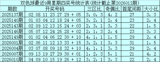 三区比分析:最近9周星期四三区红球个数比为25:14:15,第一区红球热出,本期看好第三区红球热出,关注三区比1:2:3。
