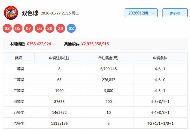 双色球第2026012期开奖号码为:03、05、07、16、20、24+08。其中红球三区比为3:2:1,奇偶比为3:3,包含2个重号:03、20,蓝球出现在第二区。