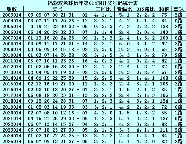 在第014期历史同期奖号中,红球三区分布总比例为55:44:39,奇偶总比例为73:65,012路比为47:45:46,和值分布在55-140之间,蓝球号码012路总比例为6:8:9。