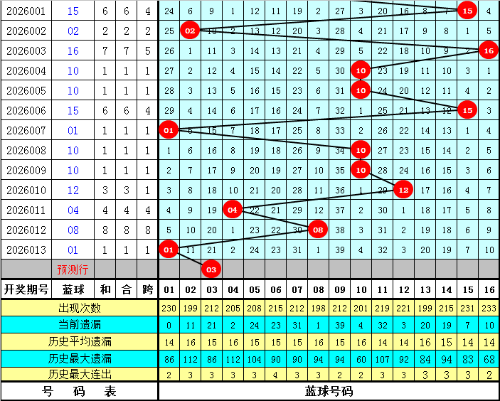蓝球走势分析:上周日第26011期蓝球开出号码04,最近十周星期日蓝球号码大小比为5:5,奇偶比为2:8,012路比为2:5:3。本期蓝球建议侧重奇数号码,参考蓝球03、15。