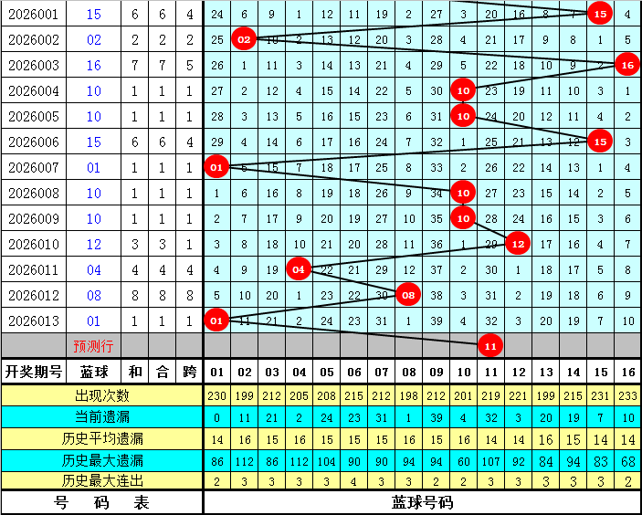 蓝球号码分析:上期蓝球为01,开出1路号码,蓝球最近10期012路比为2:7:1,最近30期012路比为8:14:8,最近100期012路比为28:39:33,本期蓝球看好2路号码,四码蓝球参考02、05、08、11。