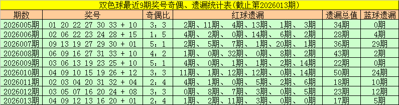 开奖回顾:双色球第2026013期开出奖号为:04 09 12 13 16 20 + 01,其中红球奇偶比为2:4,遗漏期数分别为1期、2期、11期、3期、0期、0期,遗漏总值为17期,蓝球遗漏期数为5期。