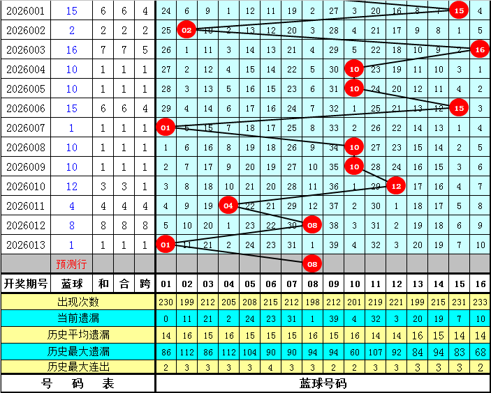 蓝球分析(定义:01-04为一区,05-08为二区,09-12为三区,13-16为四区):上期蓝球开出一区号码01,最近10期蓝球四区落号比为3:1:5:1,总体上二、四区蓝球较少,三区蓝球表现较热,本期蓝球看好在第二区开出,独蓝参考08。